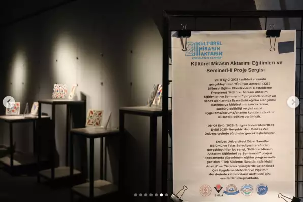 ‘Kültürel Miras’ın Aktarımı Eğitimleri ve Semineri - ll’ projesi kapsamında; Talas Belediyesi ve Erciyes Üniversitesi Güzel Sanatlar Bölümü tarafından gerçekleştirilen ‘Türk Süsleme Sanatları ve Geleneksel Çini Uygulamaları’ sergisinin açılışı gerçekleştirildi. Sergi üç gün süreyle sanatseverlerin ziyaretine açık olacaktır.